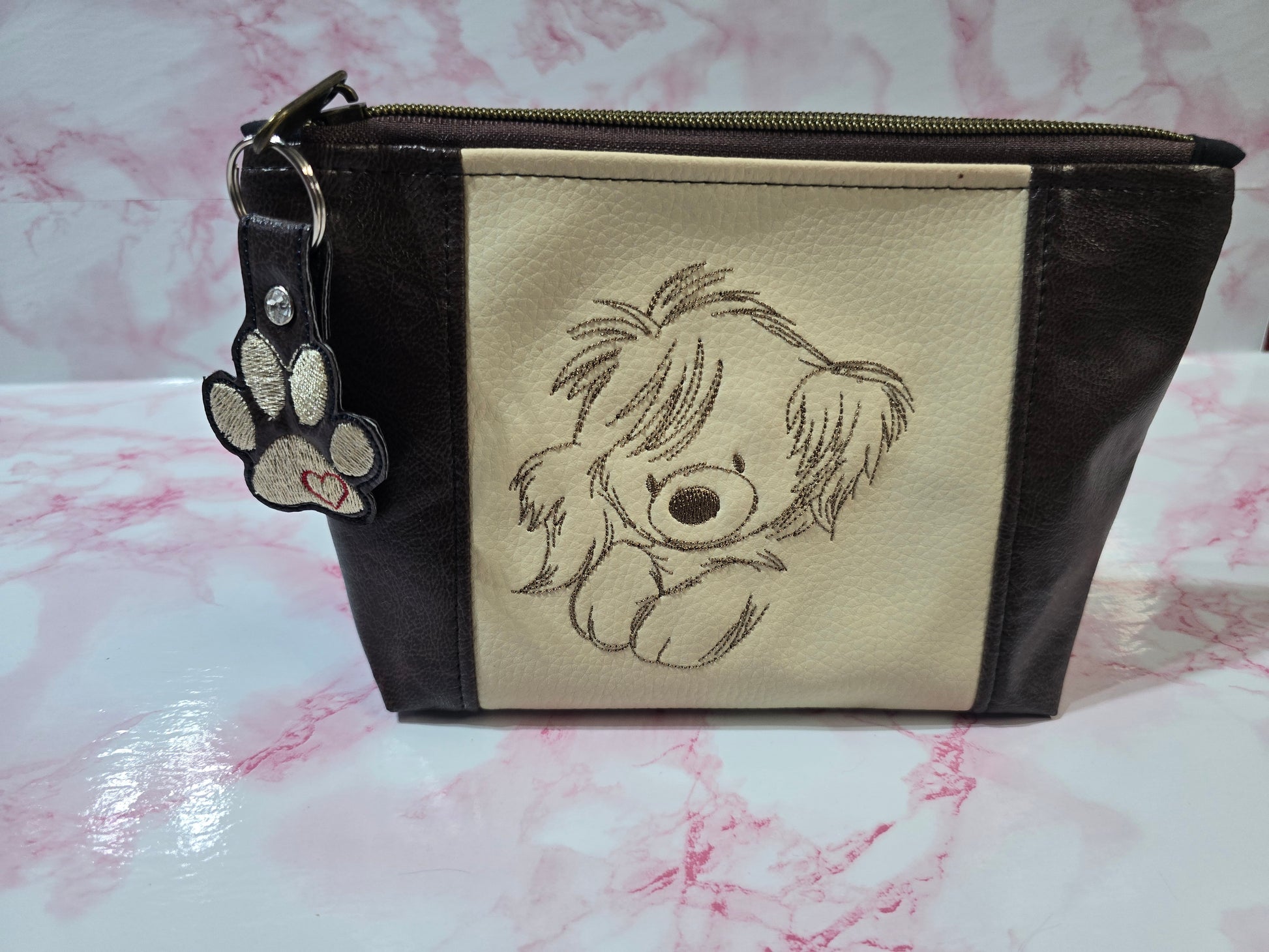 This makeup bag comes with a paw print embroidery key chain.